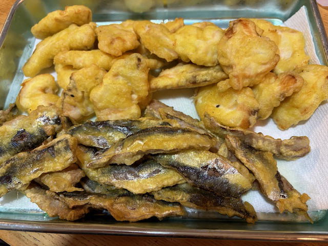 オキザワラとウルメイワシの天ぷら さつま芋の天婦羅 ほんのり甘くて旨いわ。残りは1か月寝かせると甘味が出てくるんだと。 連日の北東風で湾内に青い潮が沖から入ってきた!! 良さげな予感。