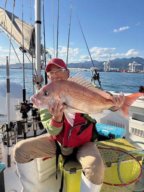 7時出船 16時沖上がり 晴れ 北東風あり 水温17℃ SANEI号船長夫妻、仙人と
