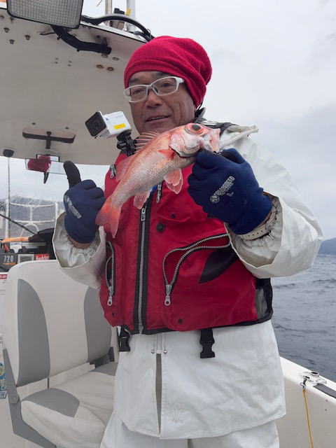 令和8年2月7日(土) 9:30-15:30仙人と 13-14℃台 曇り時々小雨 北東風で寒~~い アカムツ 一投目から釣れちゃいました 仙人は2尾