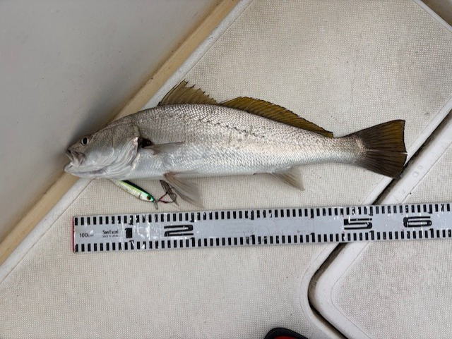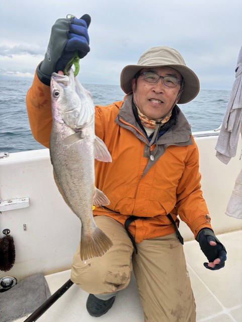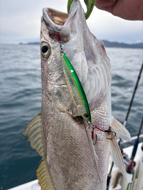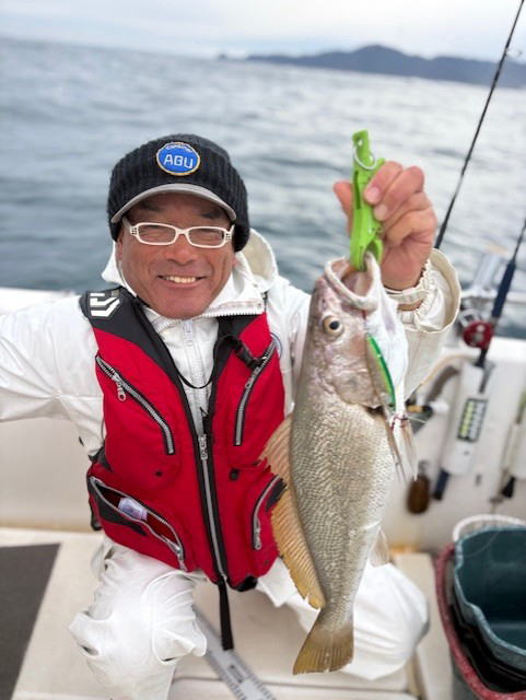 令和8年2月11日(紀元節) 9:30-16:00 ミツバシさんと 水温13-15℃台 雨のち曇り 風はないけど南からのウネリグラングラン しかも、当たり少ない一日で、、 水深17mのジギングでニベ アフターバーナー60gで 1.7kg ニベあるあるで、直後に連続ヒット!