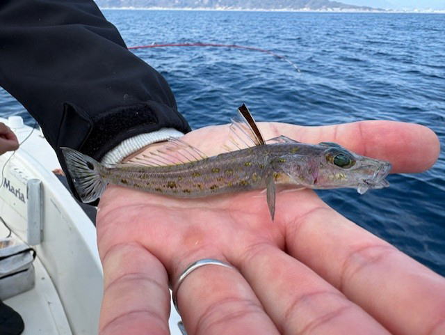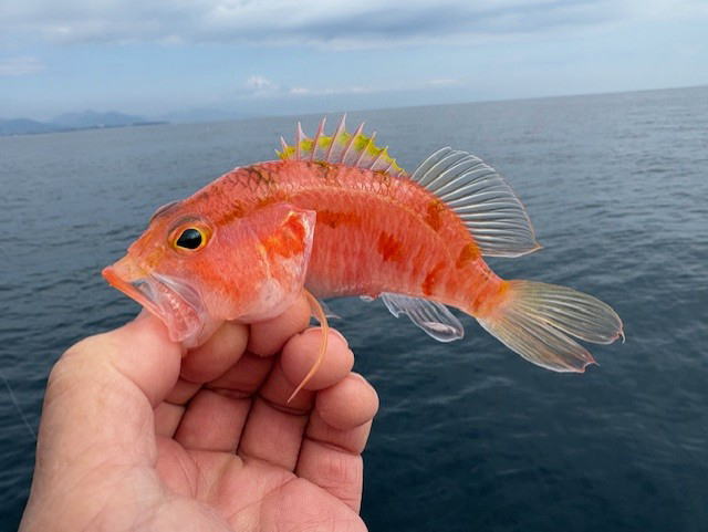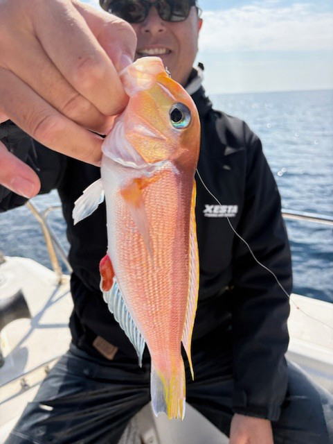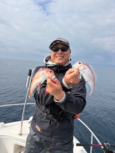 令和8年2月22日(日) 8:00-15:30 ほっしー、シュウイチさんと 水温14-15℃台 晴れ 今日はアマダイやりながら、跳ねたらキャスティング作戦 鯛場でヒット!何かな? カワイイ 連チャン 何かな?